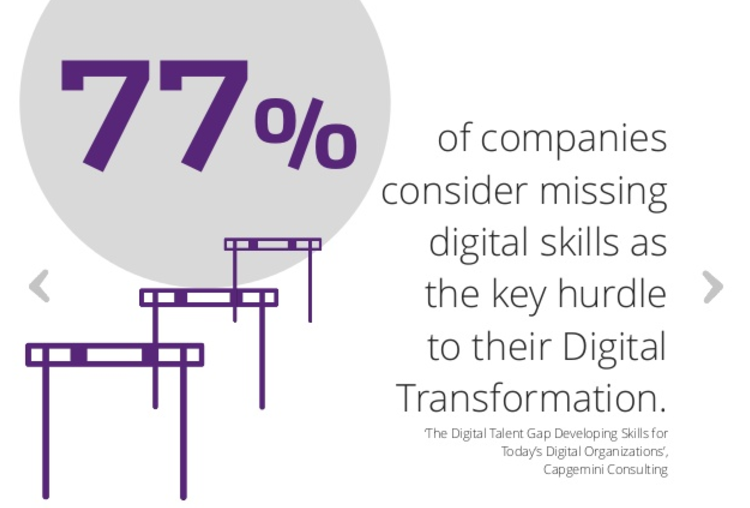 Einem Capgemini-Bericht zufolge sehen 77 % der Unternehmen den Mangel an den richtigen Fähigkeiten als größte Hürde für eine erfolgreiche digitale Transformation: