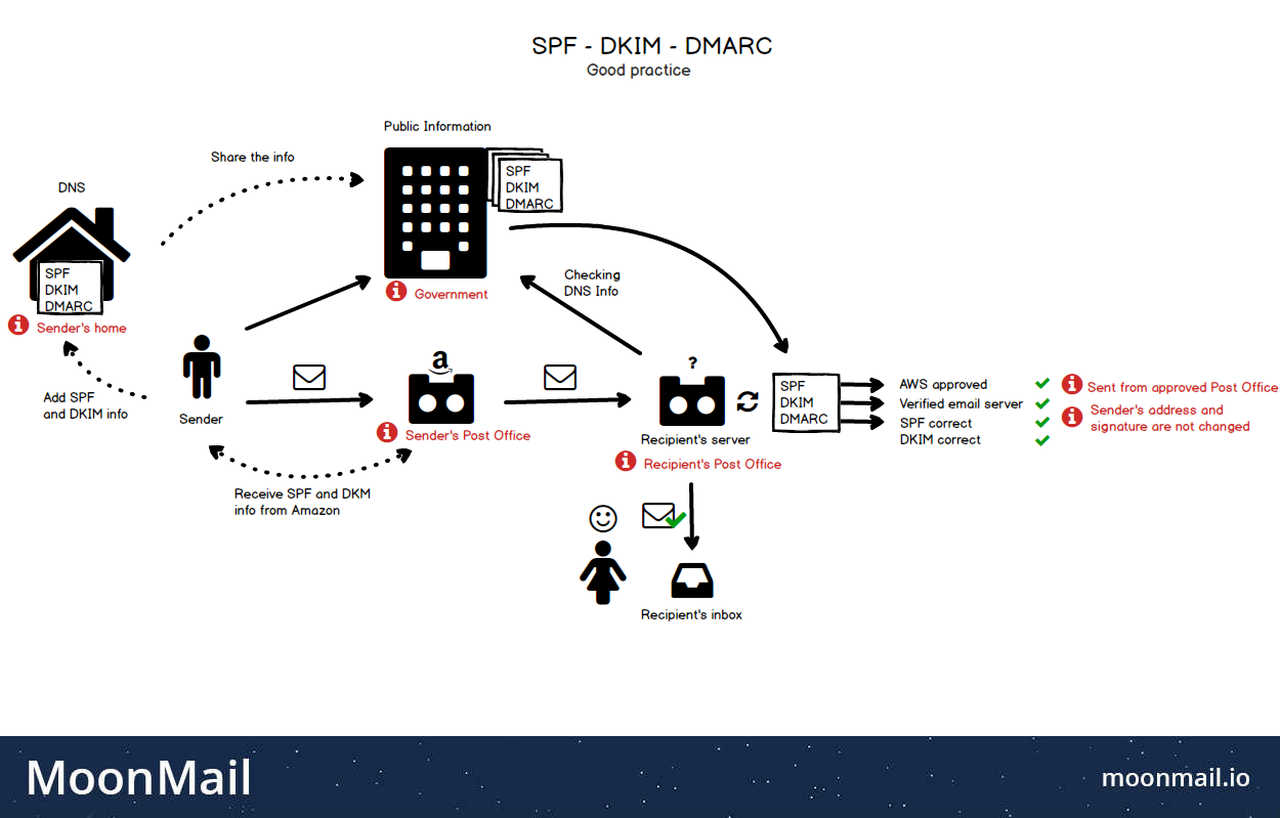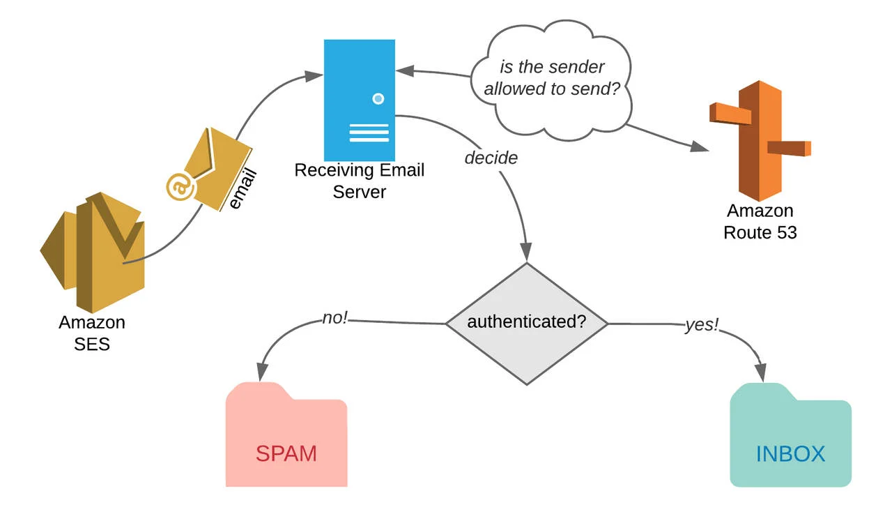 Diese Authentifizierungsmethoden verleihen Ihrer sendenden Domain Glaubwürdigkeit, indem sie den E-Mail-Empfängern bestätigen, dass eine E-Mail tatsächlich von der Domain stammt, von der sie behauptet, zu stammen. Weitere Informationen finden Sie unter Authentifizieren Ihrer E-Mail-Adresse im Entwicklerhandbuch für Amazon Simple Email Service. Auch die Verwendung von DomainKeys Identified Mail (DKIM) zum Signieren Ihrer ausgehenden E-Mails verleiht Ihrer E-Mail Glaubwürdigkeit, indem den Empfängern bestätigt wird, dass der Inhalt während der Übertragung vom Absender zum Empfänger nicht geändert wurde.