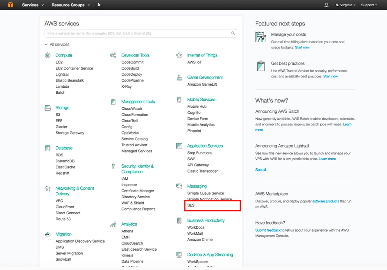 Klicken Sie hier auf https://aws.amazon.com und öffnen Sie die AWS Management Console. Danach können Sie die Amazon SES-Konsole öffnen. Sie sollten unter Anwendungsdienste suchen und SES auswählen.