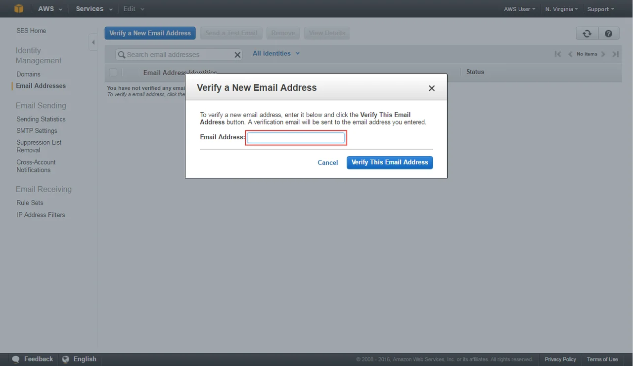 - Geben Sie Ihre E-Mail-Adresse ein und wählen Sie dann Diese E-Mail-Adresse bestätigen aus . Danach erhalten Sie von Amazon SES eine Bestätigungs-E-Mail an diese Adresse.