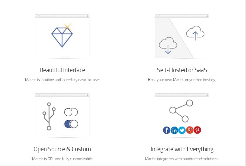 Mautic verfügt über eine Vielzahl von Integrationen wie Facebook , Amazon , Instagram , WordPress , Joomla , Dropbox , Gmail , Twitter .