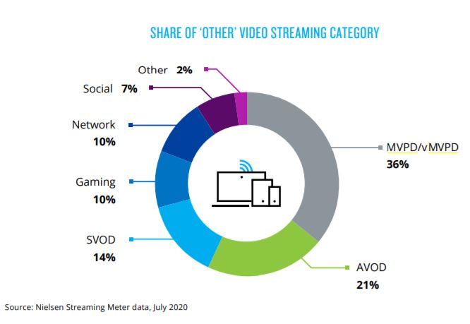 MVPD (z. B. traditionelle Kabelnetze mit Streaming-Apps) und vMVPD-Netze (z. B. Sling TV) werden in der Kategorie „Sonstige“ von Streaming-Diensten mit 36 % des gesamten Zuschaueranteils am häufigsten angesehen.