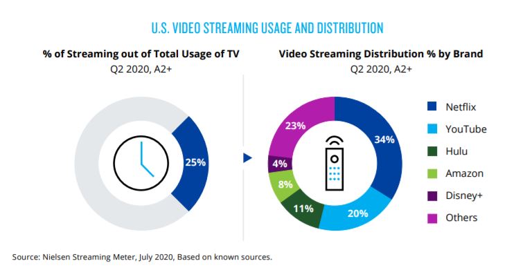 Nielsen schreibt in ihrem Beyond SVOD-Bericht : „Amerikaner ab 2 Jahren verbrachten in der Woche vom 20. Juli 2020 mehr als 123 Milliarden Minuten damit, Videoinhalte zu streamen (weit nachdem ein Großteil der USA wieder geöffnet war).“