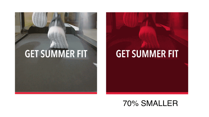 Wenn Ihre Animation Übergänge enthält, bleiben Sie bei „Schnitten“ statt „Überblendungen“. Während Schnitte von einem Bild zum nächsten springen, brauchen Fades ihre Zeit, um dieselbe Botschaft zu vermitteln. Fades beinhalten mehr Frames, mehr Farben und kommen daher mit größeren Dateigrößen. Das folgende Beispiel zeigt, wie signifikant die Auswirkungen eines Fade-Übergangs auf die Dateigröße sind. Wenn Sie einem einfachen Schnittübergang einen Fade-Effekt vorziehen, ist Ihre GIF-Datei 7,8-mal größer.