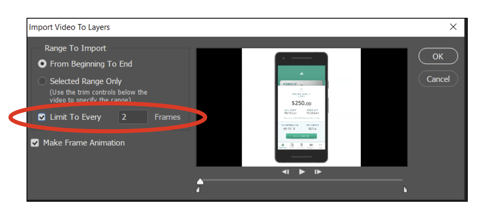 Optimieren Sie Ihre Dateigröße, indem Sie die Ebenen auf alle 2 Frames beschränken. Bei dieser Option wird jeder zweite Frame benötigt, um Ebenen zu erstellen, wodurch die Dateigröße reduziert wird. Wenn es nicht ausreicht, die Ebenen auf jeden zweiten Frame zu reduzieren, stellte Evan fest, dass es immer noch ein guter Anfang ist, wenn Photoshop nur einen von 4 Frames aufnimmt.