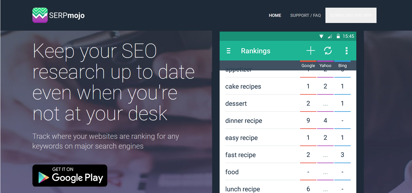 Esta app para Android erleichtert die Analyse und seguimiento SEO für alle Webs, die keine URL-Beschränkung erfordern. Podemos tambien hacer el seguimiento de aquellas palabras claves (tambien de manera ilimitada) que necesitemos posicionar y ver que lugar ocupa nuestra web en buscadores von Google, Bing und Yahoo.