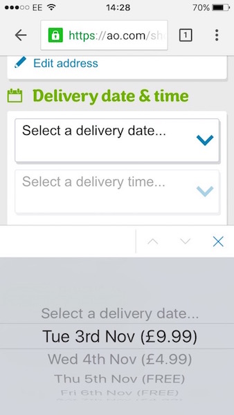 Noch besser, AO.com bietet kostenlose Lieferoptionen für nominierte Tage, solange Sie sie in den nächsten Tagen nicht benötigen.