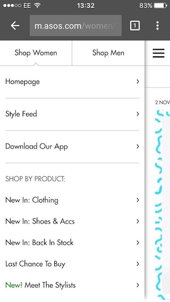 Asos erwähnt auf seiner mobilen Homepage oder im Menü keine Lieferoptionen.