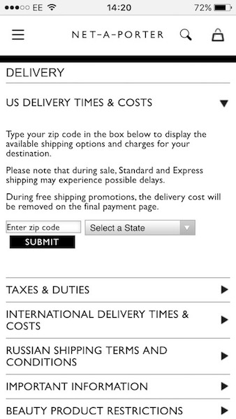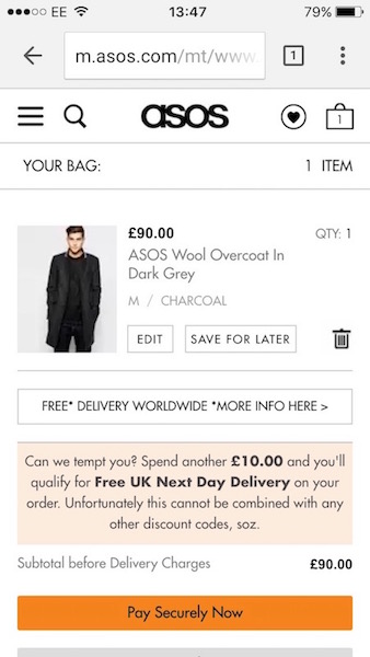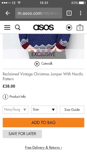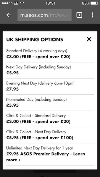 Für Asos boomt das Mobile-Commerce-Geschäft. Im Oktober gab der Einzelhändler bekannt, dass 60 % seines Traffics im letzten Jahr von mobilen Geräten stammten, während 44 % der Transaktionen auf mobilen Plattformen getätigt wurden. Dieser Prozentsatz könnte jedoch höher sein, wenn es härter bei der Präsentation seiner Lieferoptionen arbeiten würde. Asos ist nicht der einzige reine Einzelhändler, der dies fälscht…