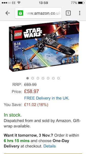 Amazon hat auf seiner mobilen Website die nervige Angewohnheit, dass Sie die Gebühr erst auf dem letzten Bildschirm kennen, wenn Sie eine Option für den nächsten Tag oder einen nominierten Tag wünschen.