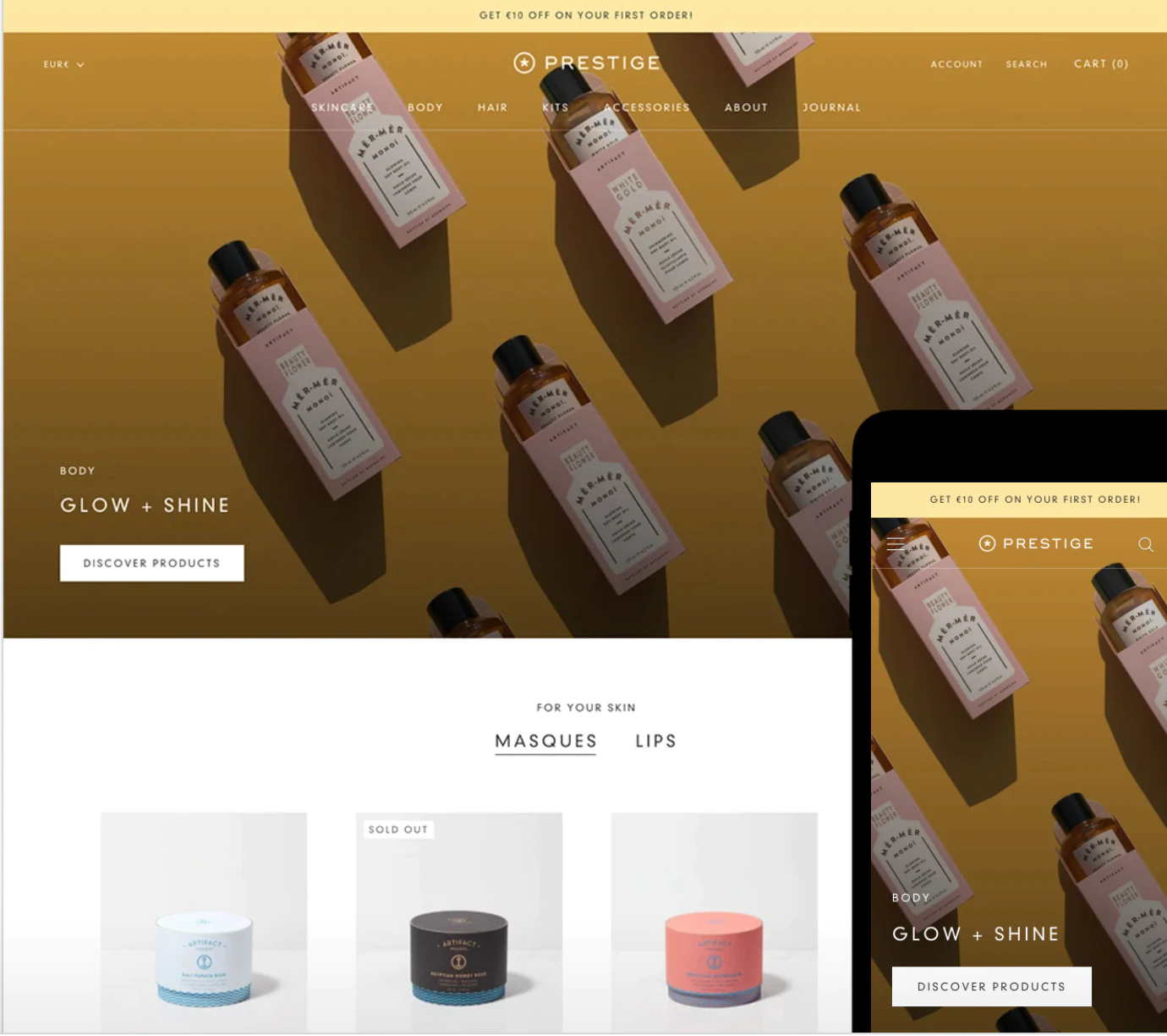 Sie sollten ein Shopify-Design auswählen, das Fotos an erste Stelle setzt und Ihre farbenfrohen Badebomben direkt auf der Startseite anzeigt. Wir schlagen Themen vor, die für Schönheitsmarken wie Simple, Broadcast oder Prestige entwickelt wurden.