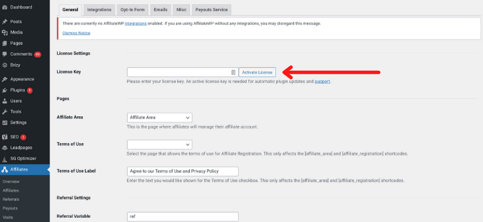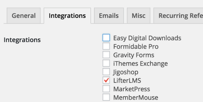 Gehen Sie in Ihren AffiliateWP-Einstellungen zur Registerkarte Integrationen .