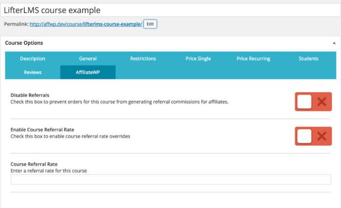 In den Reitern ganz oben sehen Sie nun AffiliateWP , klicken Sie auf diesen Reiter. In diesen Einstellungen können Sie Empfehlungen für einzelne Kurse deaktivieren und aktivieren sowie kursspezifische Empfehlungsraten festlegen.