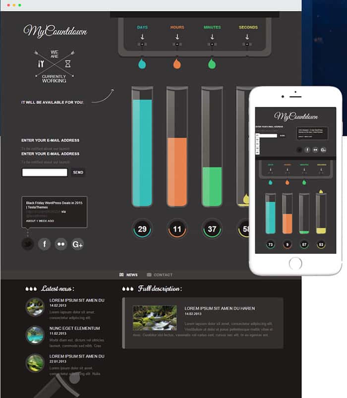Dieses Thema von Tesla Themes verfügt über einige beeindruckende Funktionen und Funktionen , mit denen Sie Ihre Website oder ein Event auf coole Weise ankündigen können. Das coolste Element dieses Themas ist der Countdown. Die 'Reagenzgläser' mit animierten Tropfen, die in jedes Röhrchen fließen.