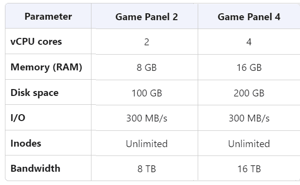 Das Game Panel 2 bietet 8 GB RAM, während Sie im Game Panel 4-Plan 16 GB RAM erhalten, was den Palworld-Systemanforderungen entspricht. Mod-Unterstützung, Root-Zugriff, Support, DDoS-Schutz und andere Funktionen wären in beiden Plänen ähnlich.