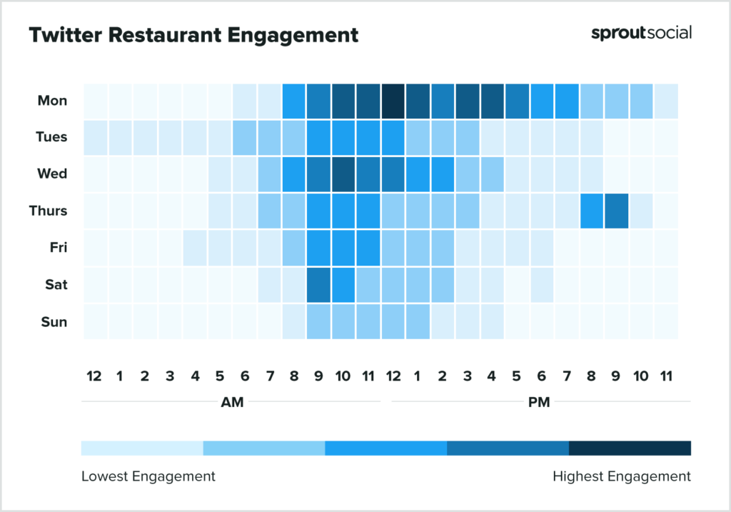 Das Twitter-Engagement für Restaurants und Bars hat sich in Bezug auf die Tage mit dem höchsten Engagement verschoben. Letztes Jahr zeigte sich, dass Mittwochs das höchste Engagement hatte, aber dieses Jahr sehen wir eine Verschiebung auf Montagmittag. Denken Sie daran, dass verschiedene Plattformen Unternehmen eine einzigartige Möglichkeit bieten, mit ihren Kunden in Kontakt zu treten. Das Angebot einzigartiger Werbeaktionen und Updates, die für jede Plattform geeignet sind, wird Ihr Restaurant für potenzielle Kunden im Gedächtnis behalten.