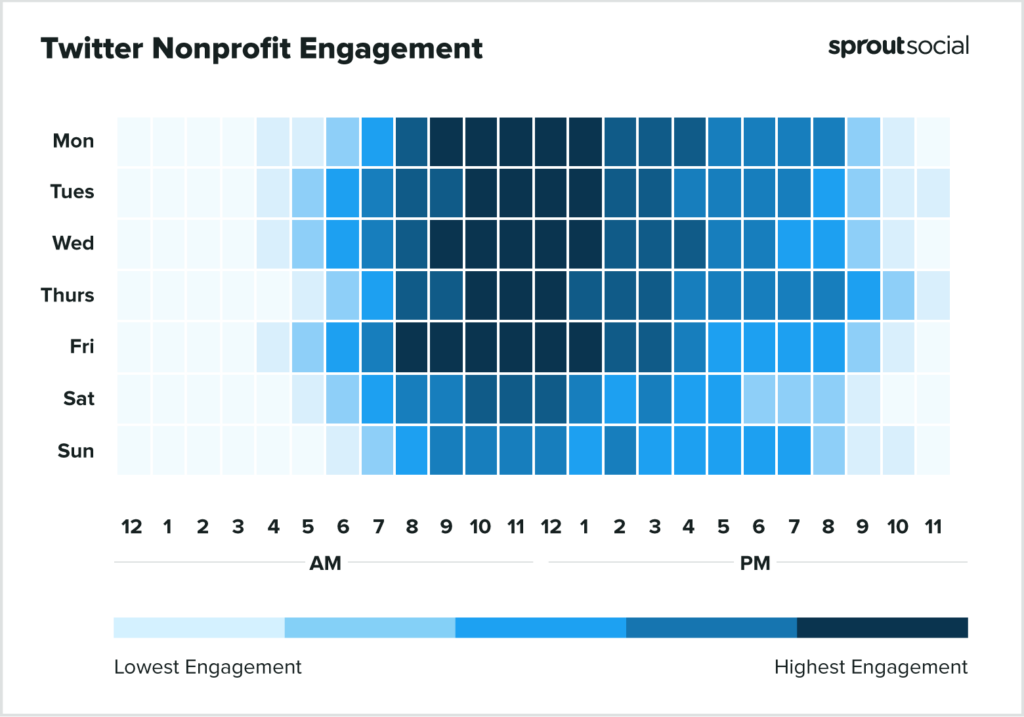 - Die besten Zeiten zum Posten auf Twitter für gemeinnützige Organisationen: montags 9 bis 13 Uhr, dienstags 10 bis 13 Uhr, mittwochs 9 bis 13 Uhr, donnerstags 10 bis 12 Uhr, freitags 8 bis 13 Uhr