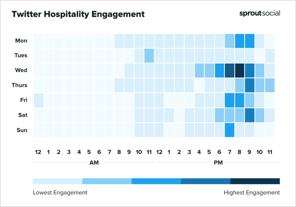 Die derzeit beste Zeit, um auf Twitter für das Gastgewerbe zu posten, ist mittwochs um 20:00 Uhr. Die Tage mit dem höchsten Engagement für Gastgewerbemarken auf Twitter sind Mittwoch, Donnerstag und Samstag.