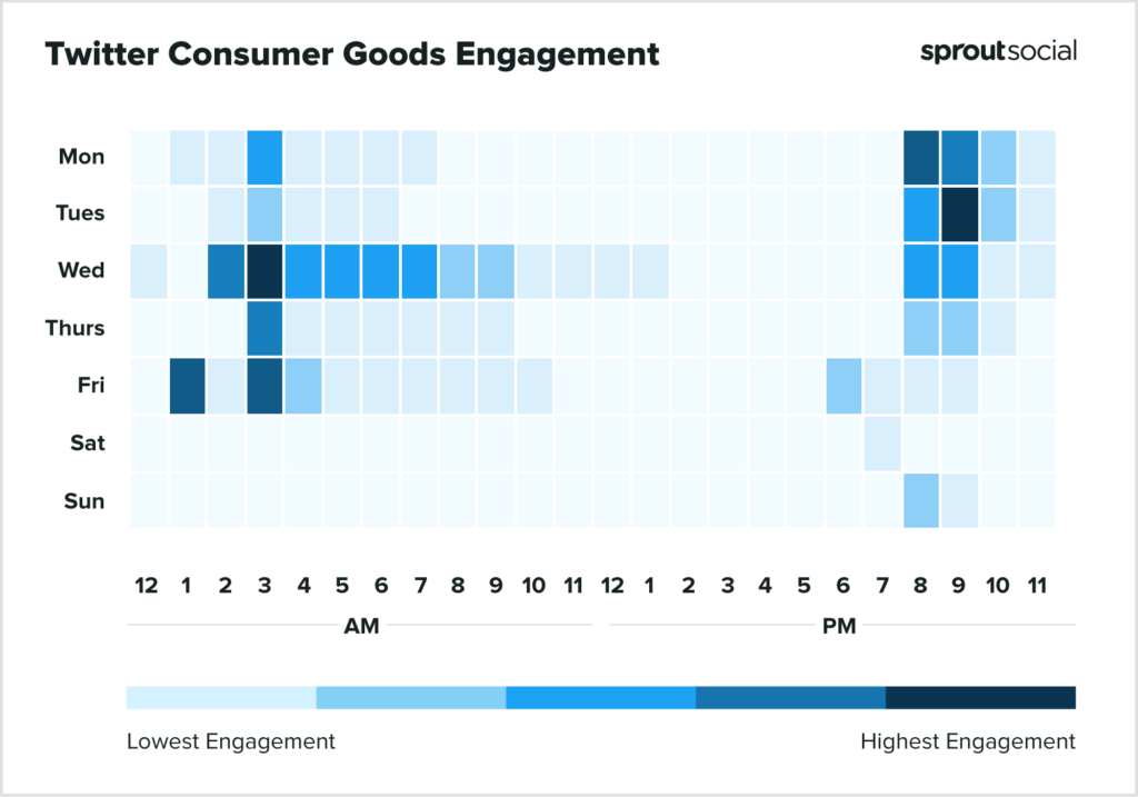 - Beste Zeiten zum Posten auf Twitter für Konsumgüter: dienstags um 9:00 Uhr, mittwochs um 3:00 Uhr