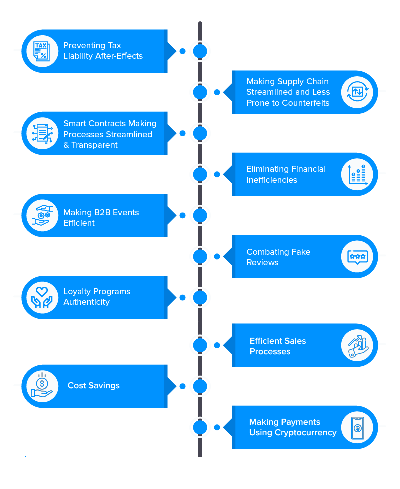 Blockchain für B2B-Netzwerke hilft Unternehmen in dieser Hinsicht dabei, Aufzeichnungen über ihren Verkauf an die Steuerbehörden zu übermitteln, wodurch sie von jeglichen Steuerverbindlichkeiten befreit werden. Die digitalen Kaufbelege , Rechnungen und andere nicht duplizierbare Einzelhandelsdokumente würden die Betrugswahrscheinlichkeit verringern und den Unternehmen eine einfache Möglichkeit bieten, Steuerrückerstattungen für ihre B2B-Einzelhandelseinkäufe zu erhalten.