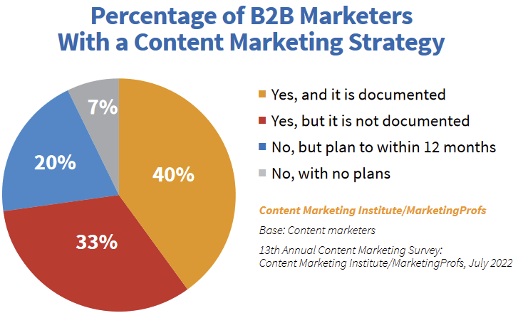 Dieselbe Studie, die in der Einleitung erwähnt wurde, besagt, dass 73 % der B2B-Vermarkter eine Marketingstrategie haben, wobei 40 % die Strategie niedergeschrieben haben.