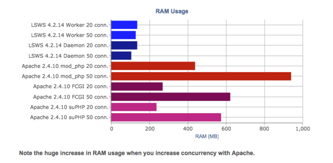 von der cPanel Conference 2014 demonstrieren die Unterschiede zwischen RAM-Nutzung und Serverlast für LiteSpeed Web Server VS Apache.