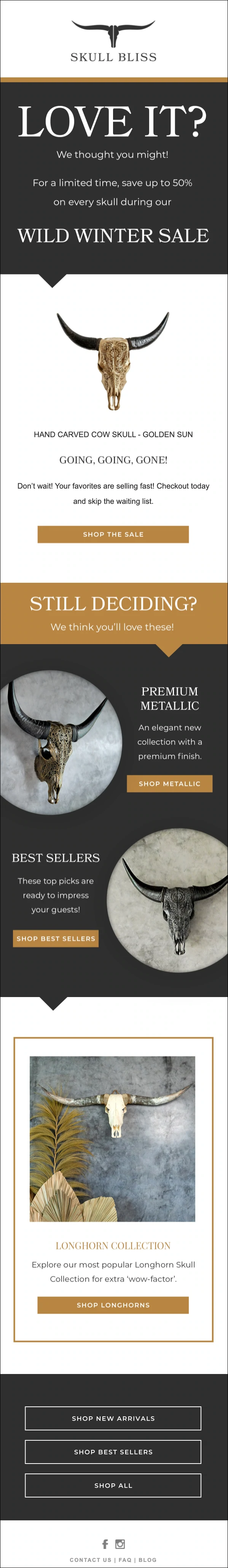 Das Angebot von Skull Bliss mit 50 % Rabatt ist faszinierend, weil es ein riesiger Rabatt ist. Die Produkte von Skull Bliss sind nicht leicht zu bekommen, und potenzielle Kunden, die die E-Mail erhalten, haben das Gefühl, dass sie einen Deal bekommen, der fast zu gut ist, um wahr zu sein.