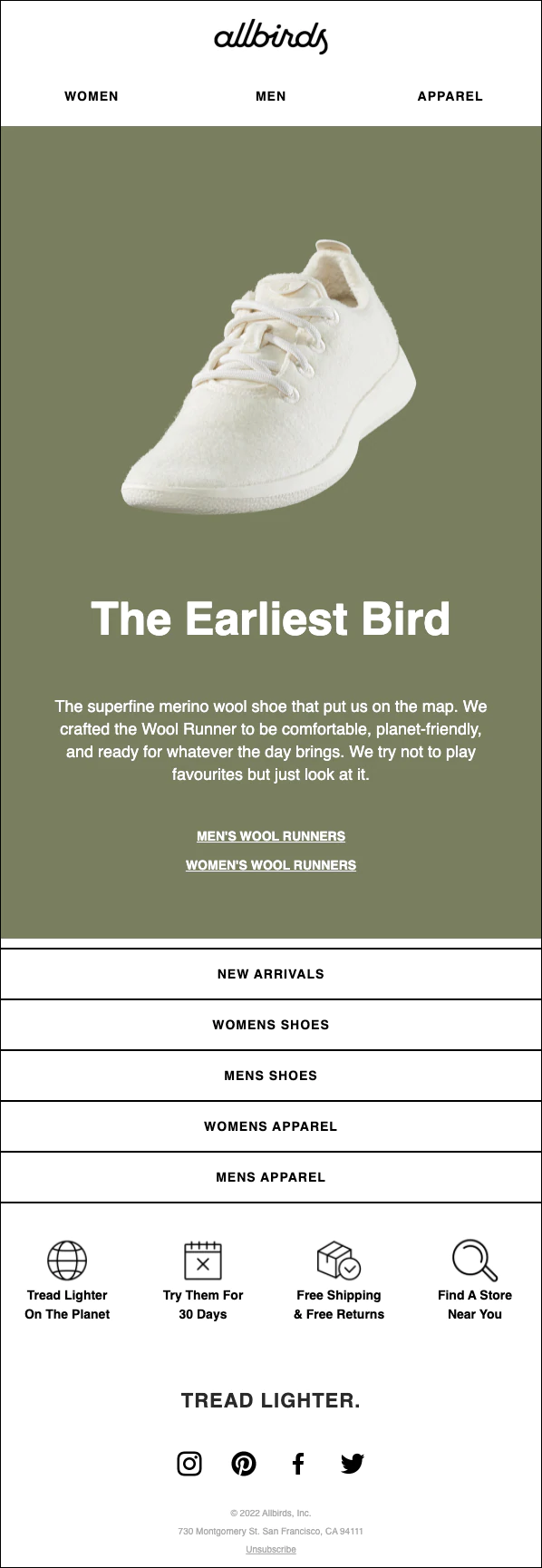Die freche Betreffzeile ist ein Hingucker (Ihr erstes was ?), aber einmal geöffnet, ist sie ein ziemlich guter Grund dafür, warum Abonnenten ihr Produkt ausprobieren sollten. Allbirds-Schuhe bestehen aus einem superweichen Wollstoff, den kein anderes Unternehmen entwickelt hat, und sind anders als alle Schuhe, die Sie zuvor getragen haben.