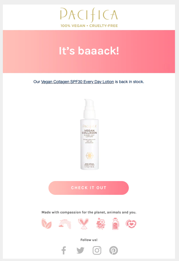 Die Betreffzeile von Pacifica, „Das Warten hat ein Ende!“, weckt ein unmittelbares Gefühl der Aufregung und zielt darauf ab, die Neugier des Lesers zu wecken und sein Interesse an dem Produkt neu zu wecken. Die personalisierte E-Mail enthält ein Bild des aufgegebenen Produkts, und die E-Mail-Kopie ist minimal und dient als sanfte Erinnerung mit einem drucklosen „Check it out“-Call-to-Action-Button.