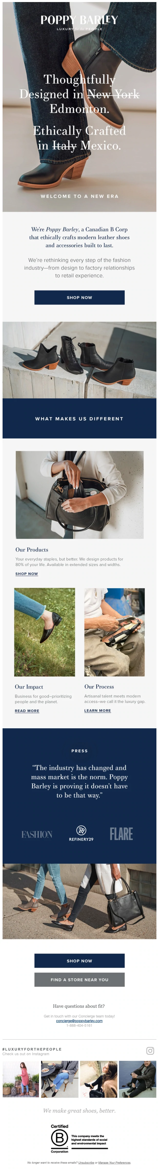 Warum es funktioniert: In „Hallo, neuer Freund!“ Poppy Barley verschwendet keine Zeit damit, sich von anderen Luxusgüterhändlern abzuheben. Das Header-Bild streicht frech „New York“ durch und ersetzt es durch „Edmonton“, wenn gekennzeichnet wird, wo Produkte gestaltet sind. Es ersetzt „Italien“ durch „Mexiko“, wenn es auflistet, wo die Produkte hergestellt werden. Dabei stellt die E-Mail einen direkten Vergleich zu ihren Konkurrenten her – High-Fashion-Unternehmen, die normalerweise in großen Modestädten wie New York und Mailand ansässig sind.