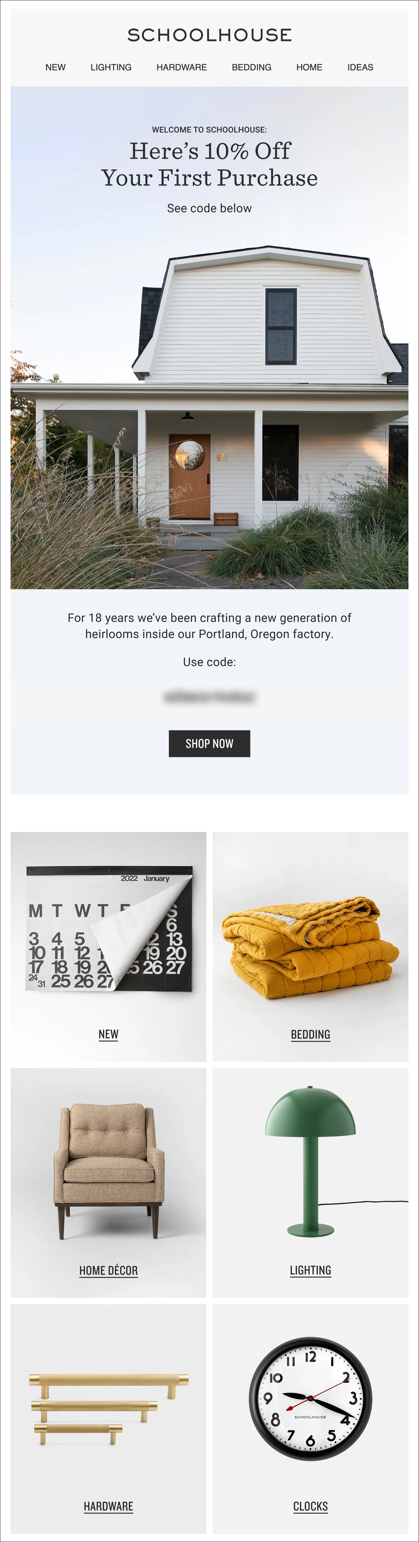 Warum es funktioniert: Der CTA von Schoolhouse verspricht Benutzern einen Rabatt von 10 %, wenn sie sich für den Newsletter anmelden. In dieser ersten E-Mail löst die sachliche Betreffzeile dieses Versprechen ein.