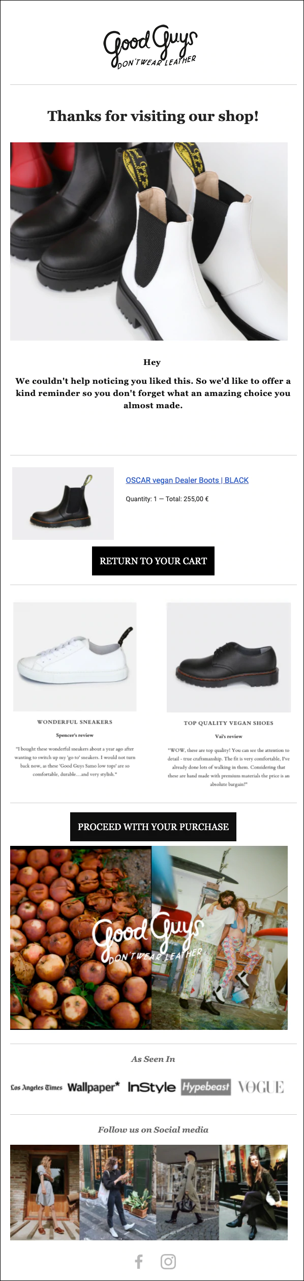 Der Inhalt der E-Mail ist personalisiert. Es beginnt mit dem verlassenen Produkt und die Kopie erinnert den Empfänger auf zarte Weise an den Kauf, den er fast getätigt hätte. Es bietet auch einen bequemen Link, um zum Shop zurückzukehren und die Bestellung abzuschließen.