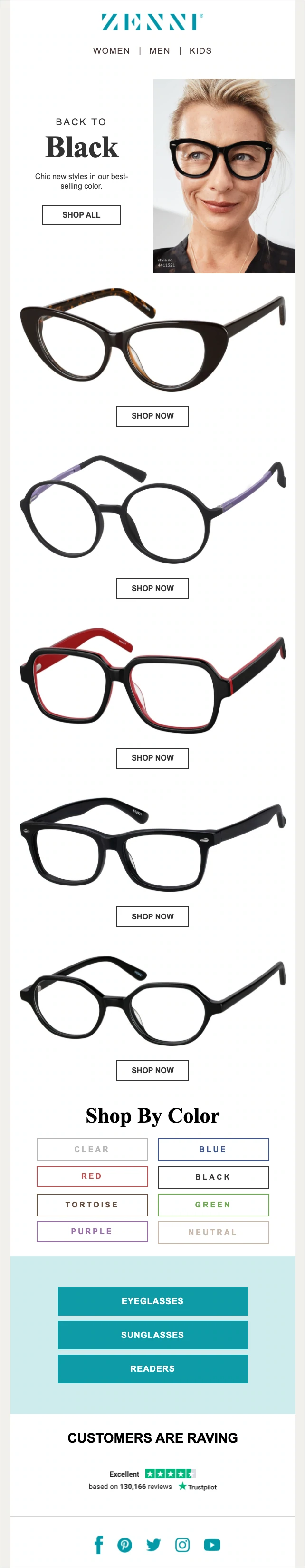 Die tatsächliche Kopie in der E-Mail ist kurz. Brillen sind ein Produkt, bei dem einzelne Käufe möglicherweise stärker gestreut sind. Das Ziel der E-Mail besteht also nicht unbedingt darin, Käufer sofort zu gewinnen , sondern Zenni's im Auge zu behalten, wenn sie ein neues Paar kaufen müssen.