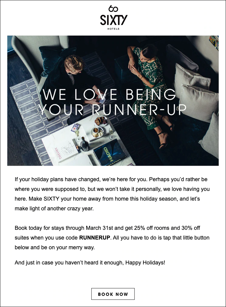 Warum es funktioniert: Als sich omicron in den USA ausbreitete, waren viele Reisende gezwungen, ihre Reisepläne zu stornieren, sodass sie um die Feiertage herum gestrandet waren. Das Thema „Wir sind ein ziemlich großartiger Backup-Plan“ ist fast selbstironisch auf eine Weise, die für eine Hotelkette, die auf Eleganz setzt, untypisch erscheint, aber es spricht die Leser auf einer sehr persönlichen Ebene an.