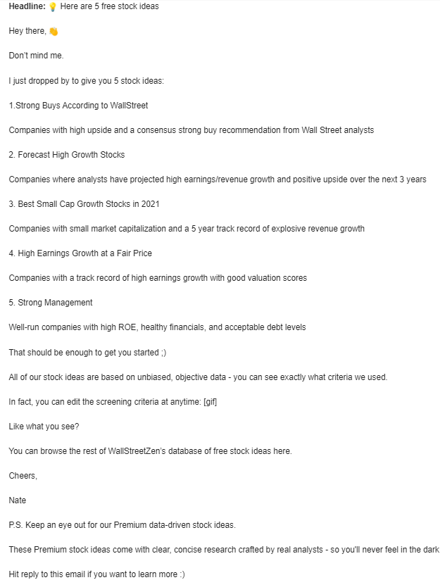 „Wir haben am Ende über die Verwendung dieses „PS“ diskutiert, aber es hat sich ausgezahlt. Indem wir den Benutzern die Möglichkeit geben, auf unsere E-Mail zu antworten, haben wir noch mehr Conversions erzielt.“ — Nate Tsang, Gründer und CEO von WallStreetZen
