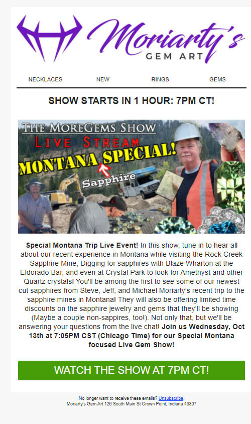 Moriarty's Gem Store hat die folgende E-Mail an Abonnenten als Erinnerung an eine bevorstehende Veranstaltung gesendet.