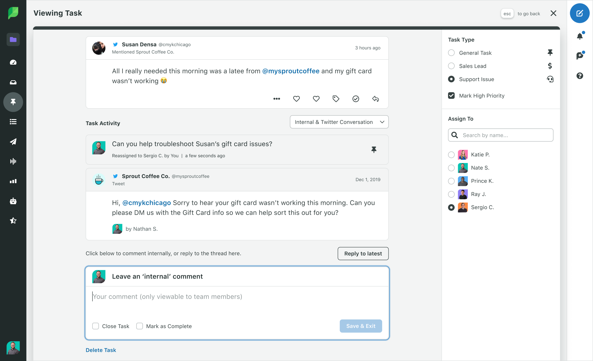 Dies ist ein fortlaufender Prozess, bei dem Sie sowohl die Stärken Ihrer Social-Media-Spezialisten oder Kundenbetreuer kennenlernen als auch Ihre Reaktionszeiten kontinuierlich verbessern müssen. Tools wie Sprout Social ermutigen Sie, beides zu tun, indem Sie die Kundeninteraktionen Ihrer Vertriebsmitarbeiter im Auge behalten.