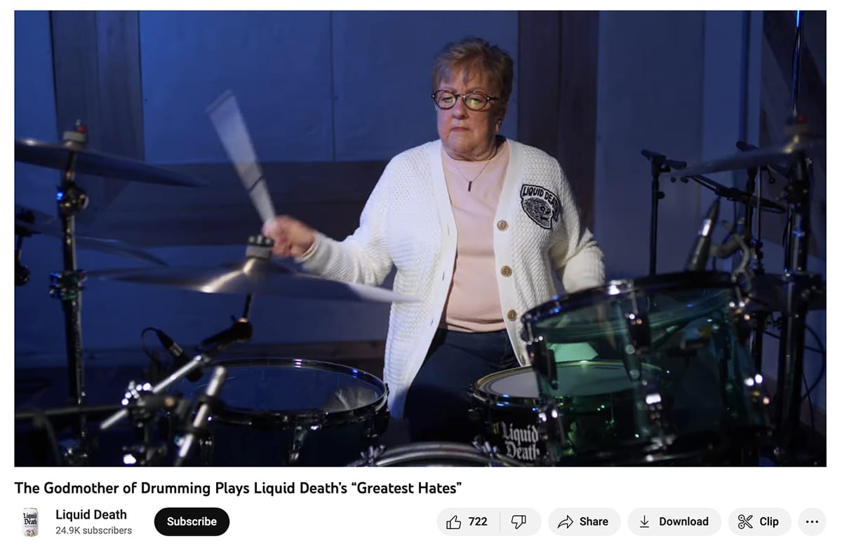 Der Slogan „Mord deinen Durst“ von Liquid Death ruft nicht immer positive Reaktionen hervor, daher hat sich die Marke das negative Feedback zunutze gemacht, um ihren Kundenstamm zu vereinheitlichen. Auf dem YouTube-Kanal von Liquid Death spielt die „Godmother of Drumming“, während eine Death-Metal-Sängerin einige der schlimmsten Hassmails der Marke schreit.