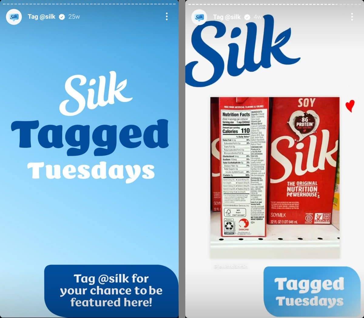 Oben teilt Silk Kundeninhalte im Rahmen der „Tagged Tuesdays“-Reihe der Marke erneut. Die Kampagne ermutigt Kunden, die Marke in ihren eigenen Inhalten zu präsentieren und zu markieren. Anschließend kann das Team die besten Beispiele zum Teilen auswählen.