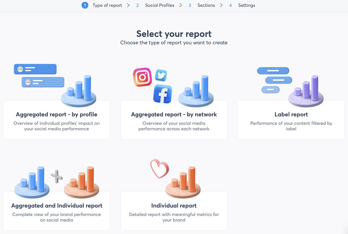 Zwischen benutzerdefinierten Berichten und ROI-Berichten können Sie KPIs verfolgen, Fortschritte messen und den Wert der Social-Media-Marketingarbeit Ihres Teams nachweisen – ohne Berichte manuell erstellen zu müssen.