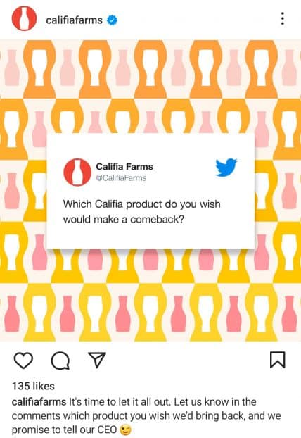 Denken Sie darüber nach, ein neues Produkt auf den Markt zu bringen oder einen neuen Einzelhandelsstandort zu eröffnen? Möchten Sie das Kundeninteresse abschätzen, bevor Sie eine offizielle Ankündigung machen? Fragen Sie Ihre größten Fans direkt, wie es Califia Farms auf Instagram tut.