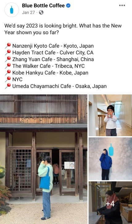 Auf Facebook weist Blue Bottle Coffee auf mehrere Standorte hin, an denen Kunden den Dosenkaffee und die Café-Getränke der Marke kaufen können. Durch die Aufnahme mehrerer Standorte in einem einzigen Beitrag kann die Marke ihre vielfältigen Standorte präsentieren und Kunden zu einem Besuch anregen.