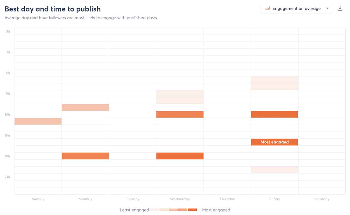 Sie fragen sich, wann Ihr Publikum online und engagiert ist, damit Sie Inhalte zum idealen Zeitpunkt veröffentlichen können? Agorapulse generiert benutzerdefinierte Veröffentlichungsempfehlungen für jeden Kanal, damit Sie wissen, wann Sie Beiträge veröffentlichen müssen.