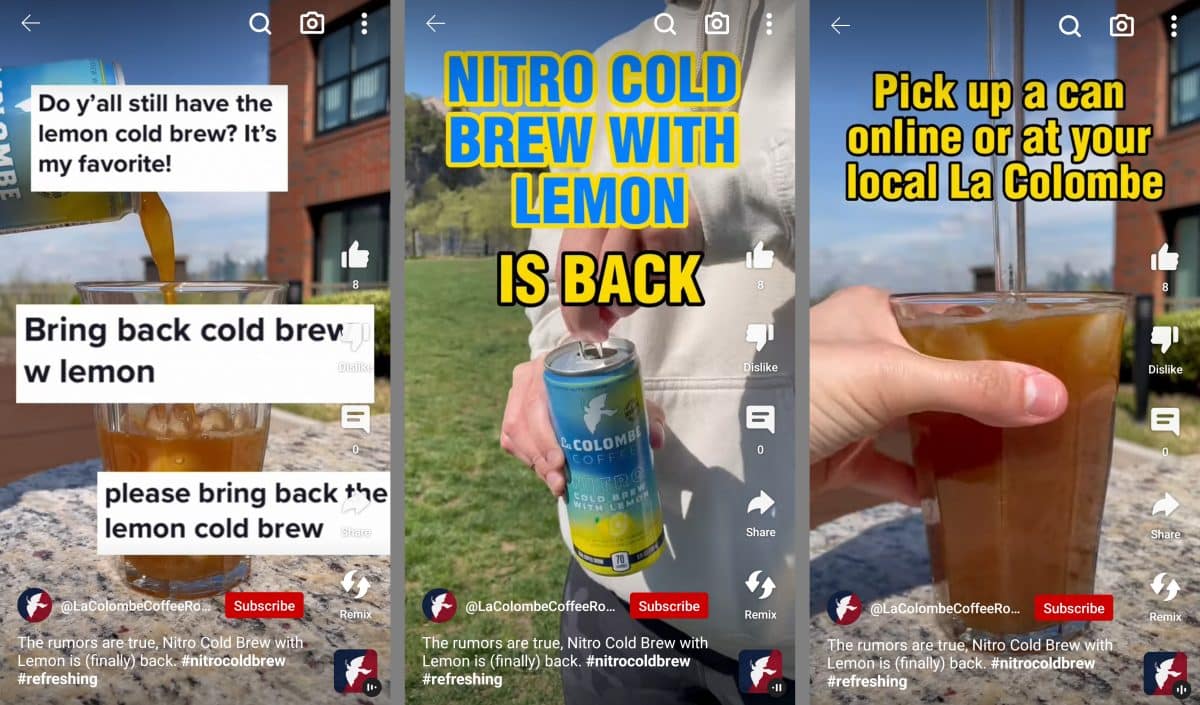 Oben nutzt La Colombe YouTube, um die Rückkehr eines meistverkauften Kaffeegetränks anzukündigen. Das Video hebt Kommentare von Kunden hervor, die die Rückgabe des Getränks fordern, bevor es seine (Wieder-)Einführung ankündigt und den Zuschauern sagt, wo es zu finden ist.