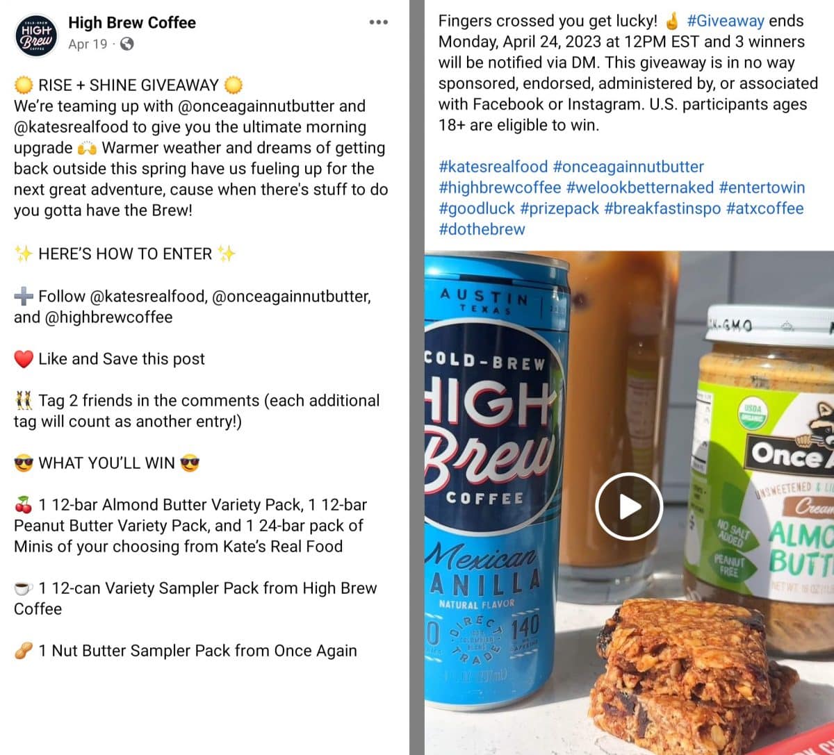 Oben veranstaltet High Brew Coffee ein Facebook-Gewinnspiel mit Once Again Nut Butter und Kates Real Food. Durch Cross-Posting des Giveaways auf Facebook und Instagram können die drei Marken die Wirkung der Kampagne maximieren.
