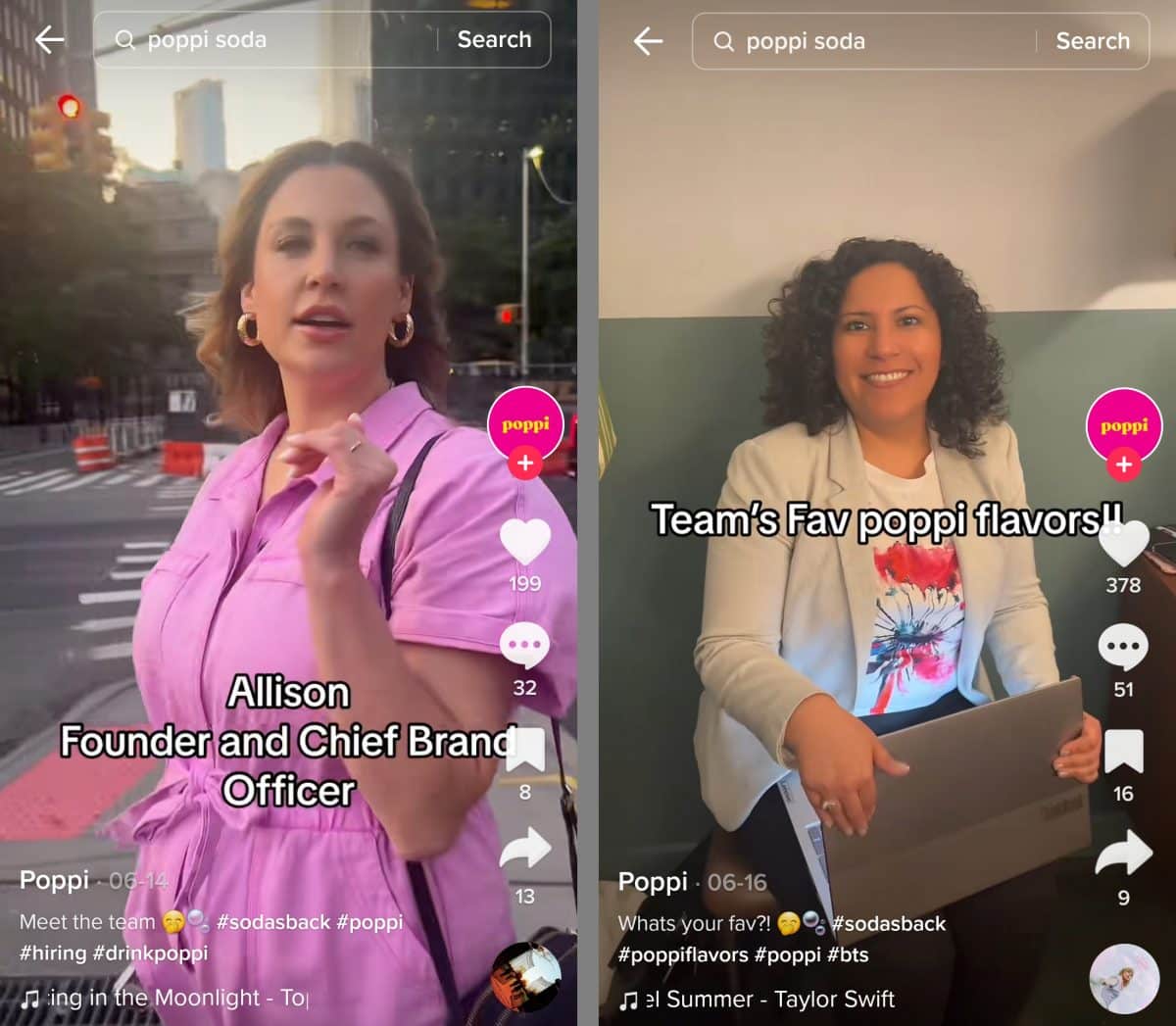 Die Limonadenmarke Poppi stellt ihr Team regelmäßig auf TikTok vor. Oben links stellt die Marke wichtige Teammitglieder vor und oben rechts enthüllt das Kurzvideo die Lieblingspoppi-Sorte jedes Teammitglieds.