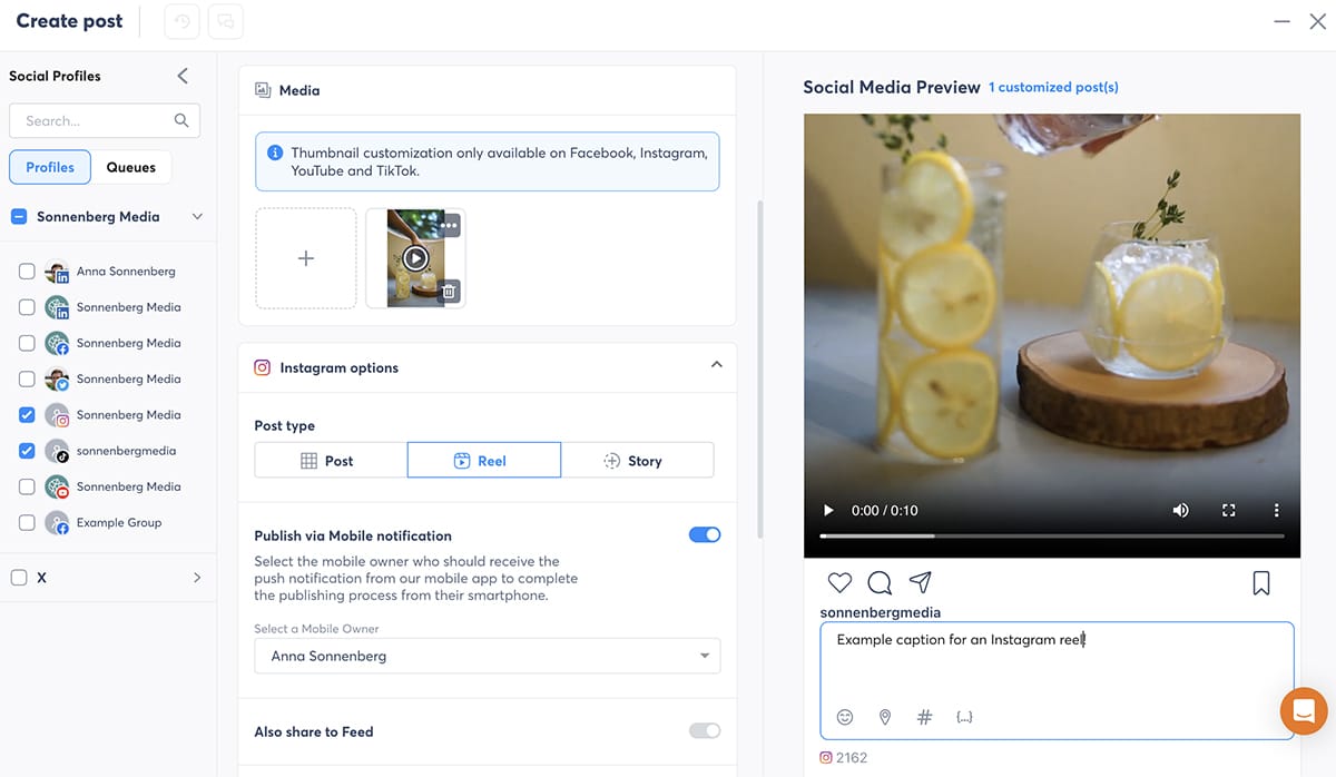 Im Post Composer können Sie die Veröffentlichung auch manuell abschließen, nachdem Sie eine Benachrichtigung auf Ihrem Mobilgerät erhalten haben. Mit diesem Workflow kann Ihr Team Kurzvideos lizenzfreie Musik, Trendsounds oder interaktive Aufkleber hinzufügen.