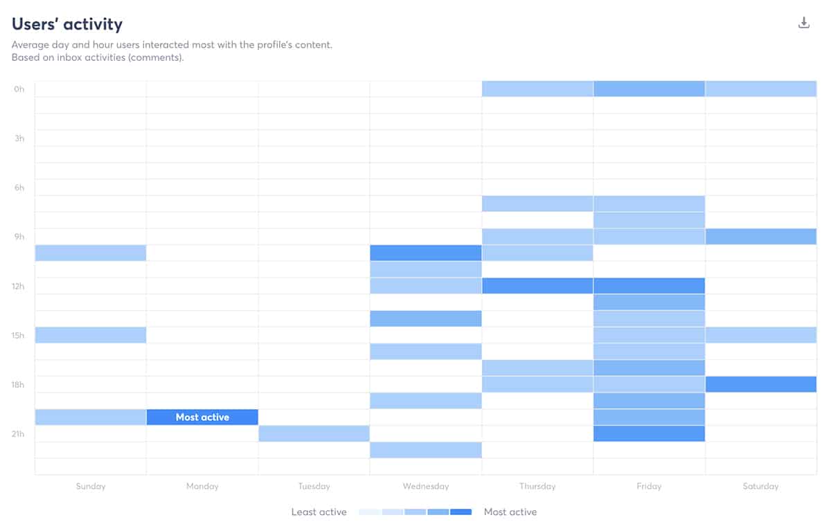 Agorapulse stellt Benutzeraktivitätsberichte bereit, damit Sie sehen können, wann Follower am wahrscheinlichsten mit Ihren Konten interagieren. Diese Daten können Ihnen dabei helfen, Ihre Teams entsprechend zu besetzen, damit sie schnell reagieren können.