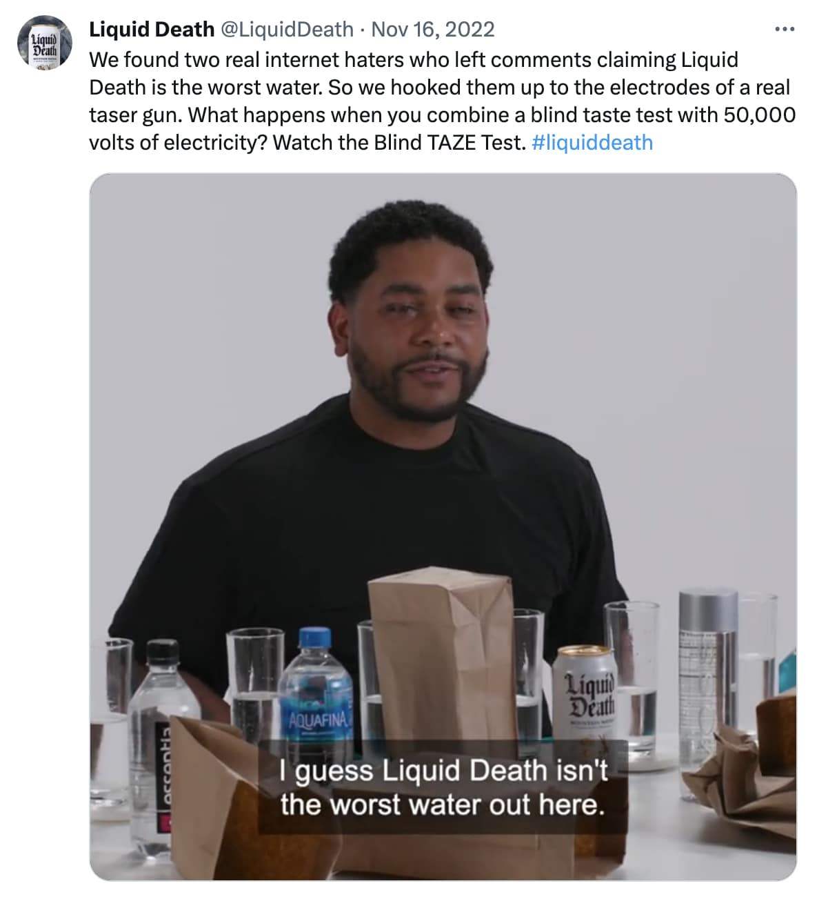 Auf Twitter lädt Liquid Death Benutzer, die negative Kommentare hinterlassen haben, dazu ein, ihr Wasser mit anderen in der Kategorie zu vergleichen – und ermutigt sie, ihre Meinung während eines „Taze“-Tests zu überdenken.