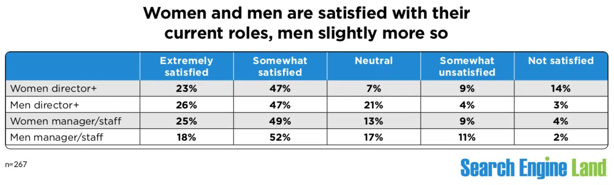 Männer sind etwas zufriedener mit ihren aktuellen Rollen. Den Umfrageergebnissen zufolge gaben sowohl Frauen als auch Männer ein hohes Maß an Zufriedenheit mit ihrer derzeitigen Rolle an. Frauen gaben jedoch im Vergleich zu Männern etwas höhere Werte für „extreme Zufriedenheit“ an: